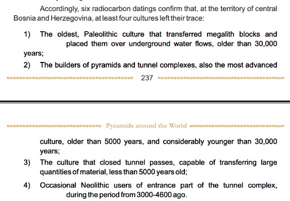 Dr. Osmanagich would no doubt agree that linear development of humanity must be given up. Apparently, the scientists doing the radiocarbon analysis on the Bosnian Pyramid of the Sun, identified four (4) different sets of dates from submitted samples: